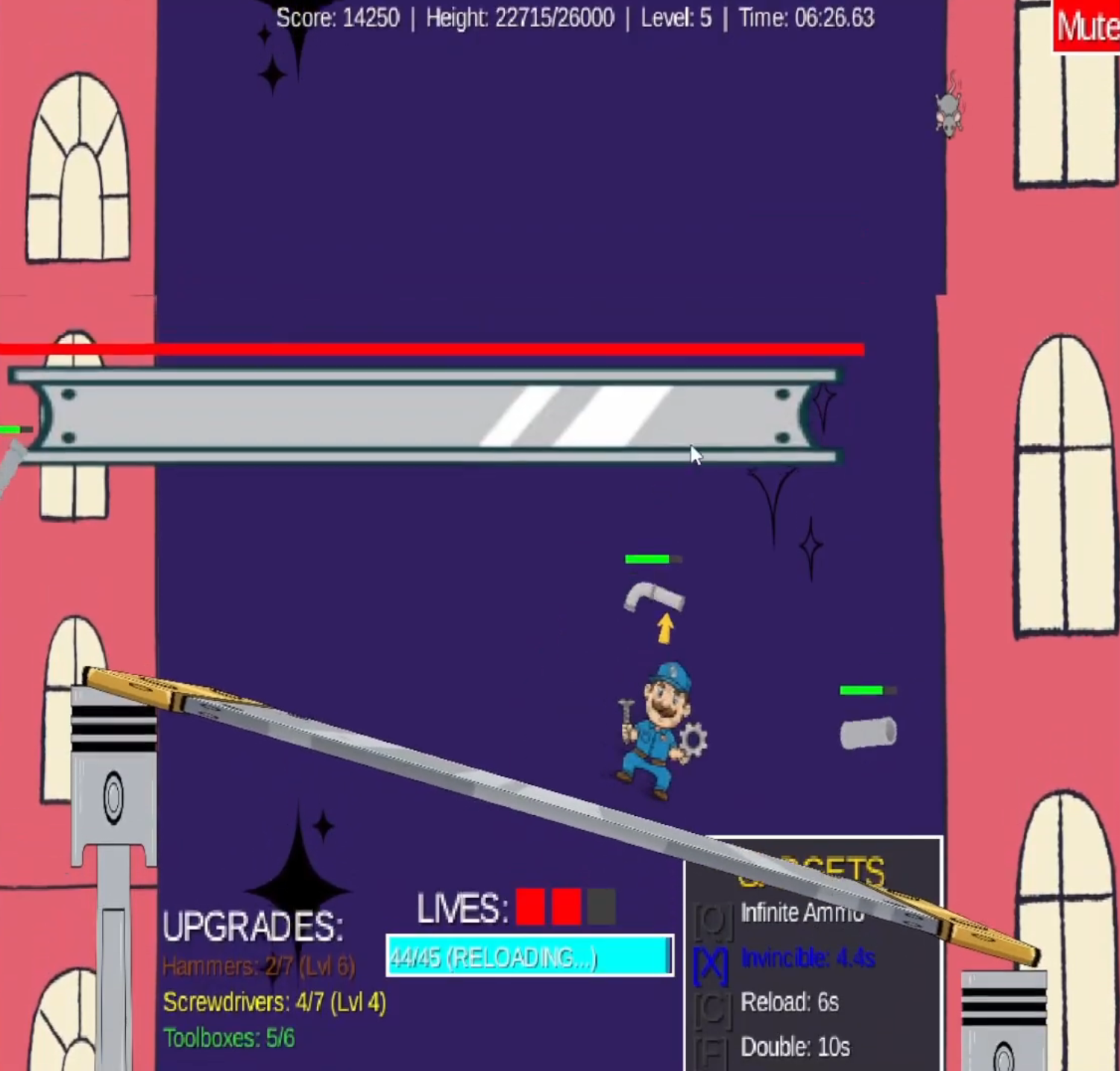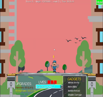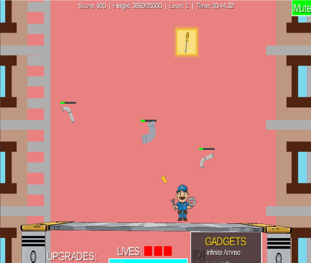 The player uses the piston mechanics and their tools to dodge and shoot enemies, and try to collect upgrades to make the game easier as it gets harder.